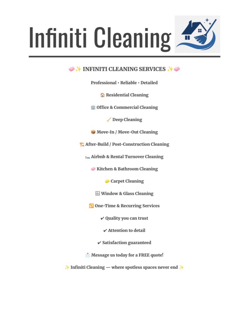 At Infiniticleaning, we are dedicated to providing top-quality cleaning services for homes and beyond. Our team of professionals is committed to making your space spotless and refreshed, ensuring a healthier and more comfortable environment for you and your family.